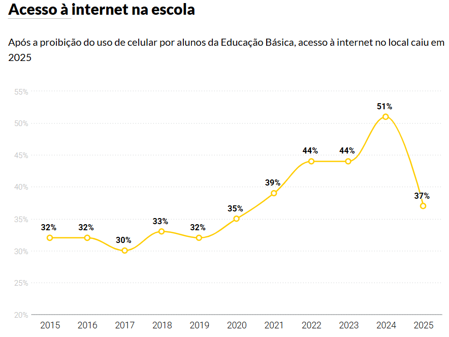 Mas a diminuição de crianças usando aparelhos já pode ser sentida nas escolas. O uso da internet em sala de aula caiu para 37%, o menor nível desde 2020 — em 2024, era de 51%.A queda coincide com a nova lei sancionada pelo governo federal em janeiro, que proíbe o uso de celulares nas escolas de todo o país. | ![]() |