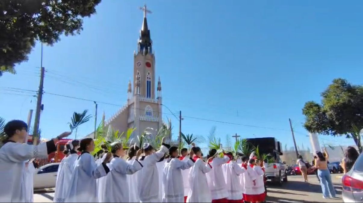 Centenas de fiéis católicos participaram, na manhã deste domingo (29), da celebração do Domingo de Ramos na Paróquia São Francisco de Assis, em Catalão.