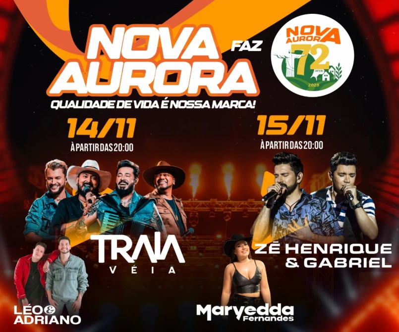 A cidade de Nova Aurora está em clima de festa! Nos dias 14 e 15 de novembro, a Prefeitura Municipal realiza a grande celebração dos 72 anos de emancipação política, com uma programação repleta de música, alegria e muita diversão. O evento acontecerá na Praça Allan Kardec, no Parque das Palmeiras, e promete reunir moradores e visitantes em um dos momentos mais esperados do ano.