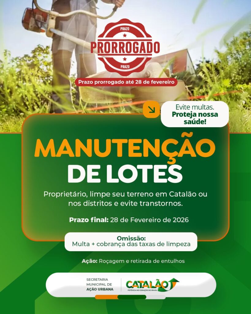 A Prefeitura de Catalão prorrogou o prazo para a limpeza obrigatória de lotes no município.